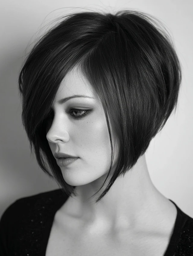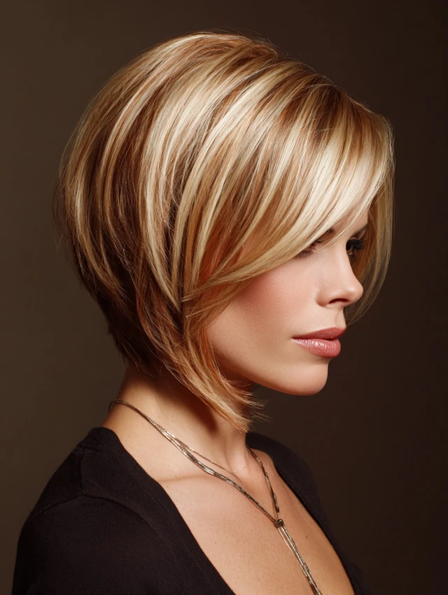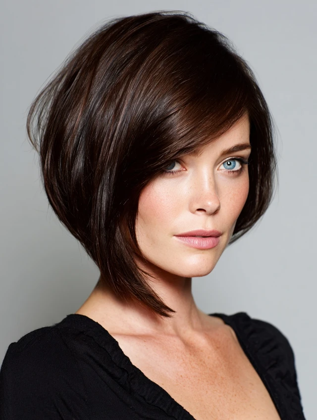 The angled bob creates a modern, flattering silhouette that elongates the neck and frames the face elegantly.
