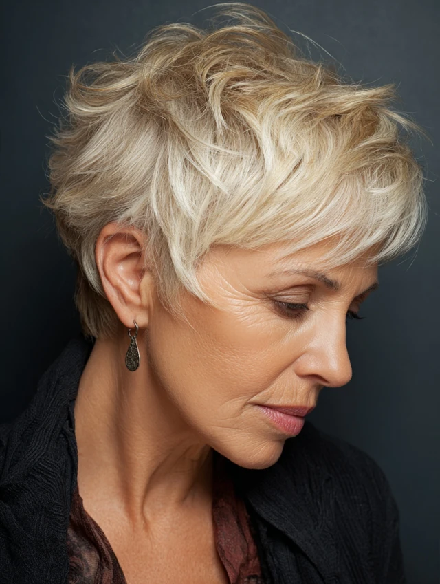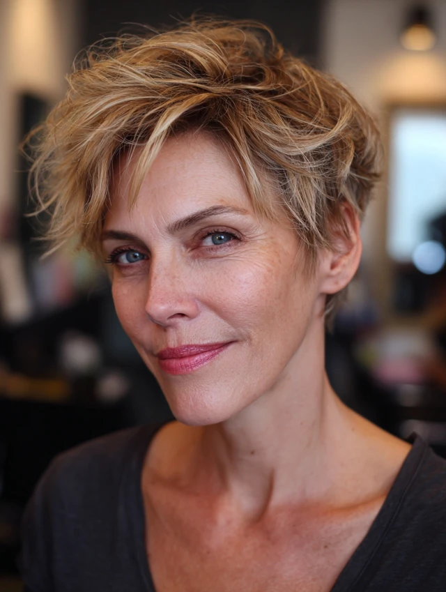 A tousled pixie style embraces natural texture, creating movement and a slightly undone finish. The texture adds volume without effort.