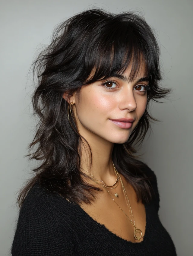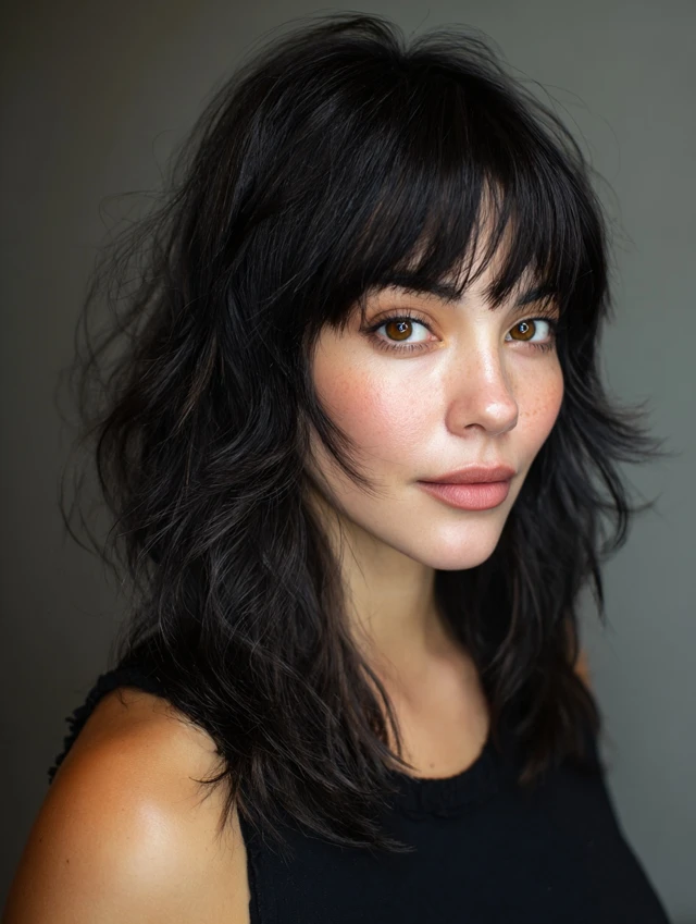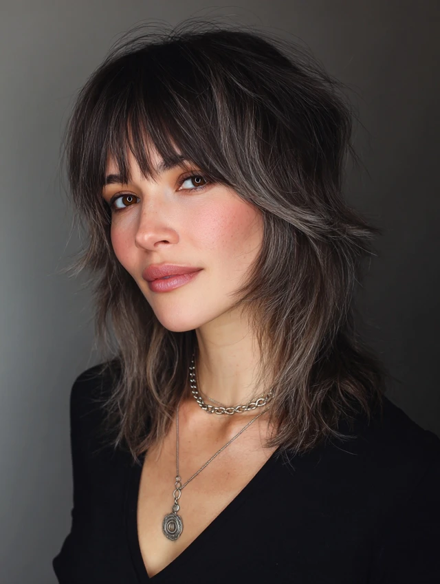 Bangs soften the face while blending with choppy layers for a modern look.