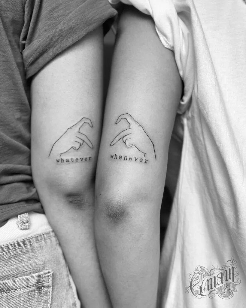 This minimalist tattoo set pairs simple hand outlines with the words “whatever” and “whenever,” symbolizing unconditional sibling support. Inked on the arms in fine-line style, it captures the essence of “always there for you” in a sleek, understated design.