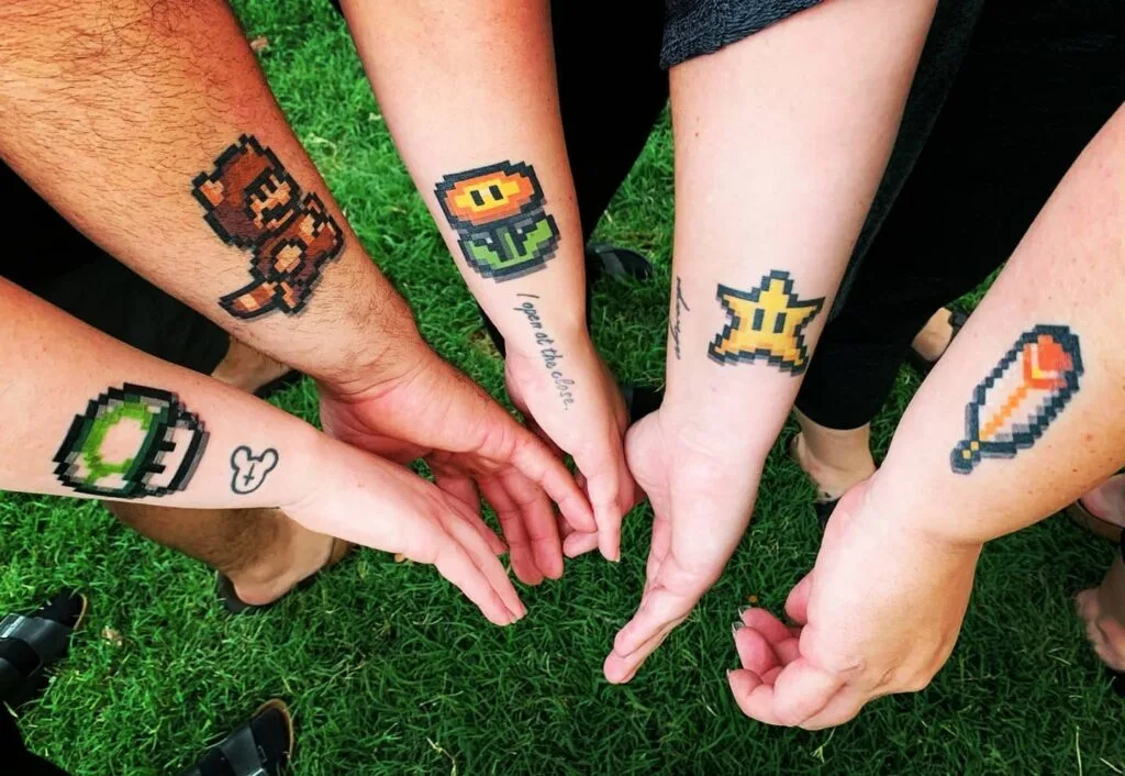 This group of siblings chose nostalgic 8-bit Super Mario tattoos to symbolize their unity. Each arm features a different power-up item, from the star to the mushroom and fire flower, reflecting individuality while staying connected through a shared theme.