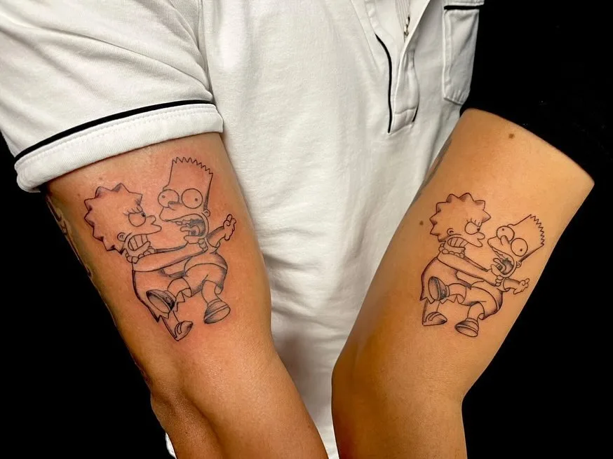 Featuring Bart and Lisa Simpson in their classic sibling quarrel, this tattoo perfectly captures the playful chaos of brother-sister dynamics. Placed on the arms, the simple line work emphasizes humor and authenticity rather than perfection.