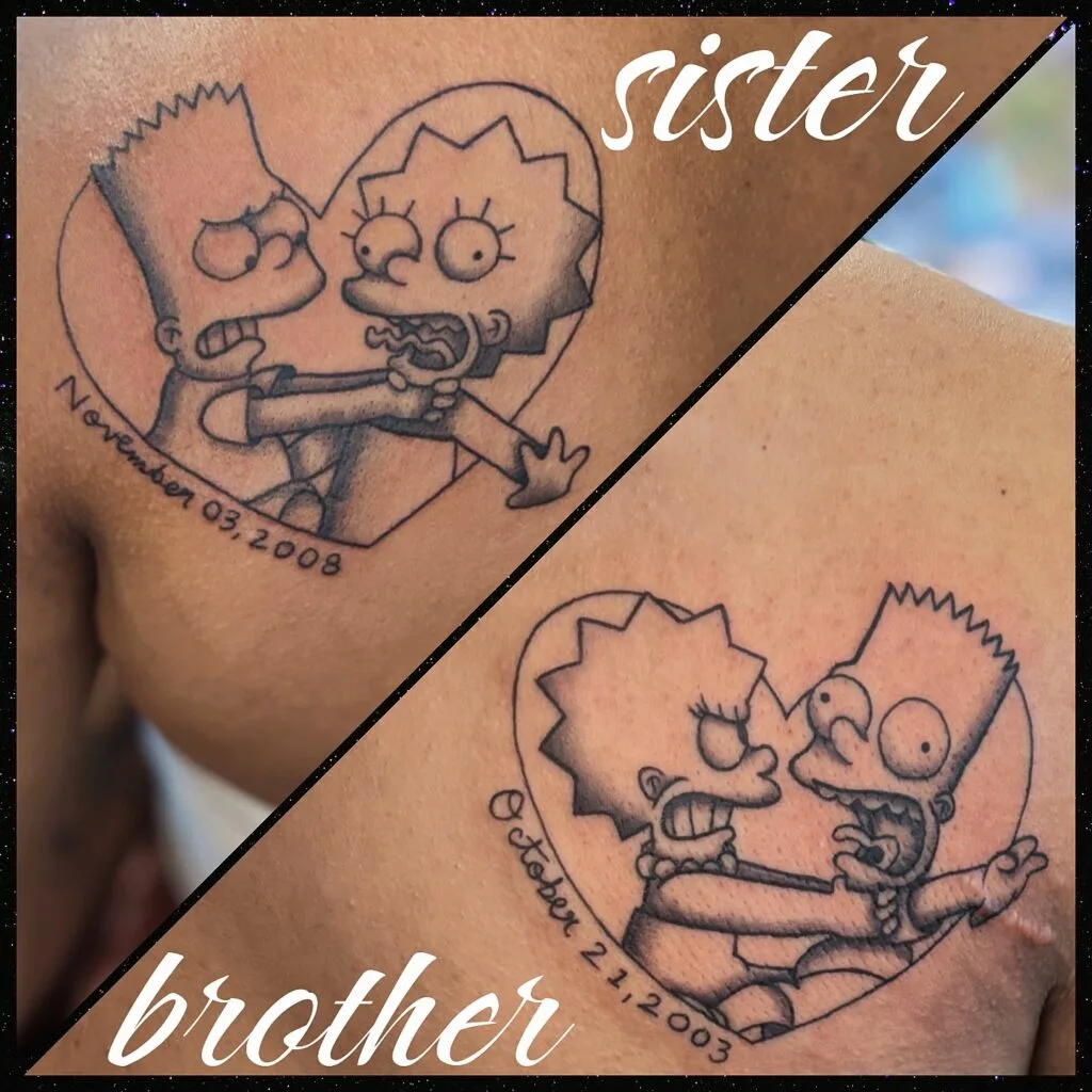 This clever tattoo design splits an image of Bart and Lisa into two halves, each completed when siblings stand together. The heart-shaped outline symbolizes love, while the playful depiction of sibling rivalry highlights authenticity. The tattoos are personalized with dates, making them uniquely meaningful to the brother and sister who wear them.