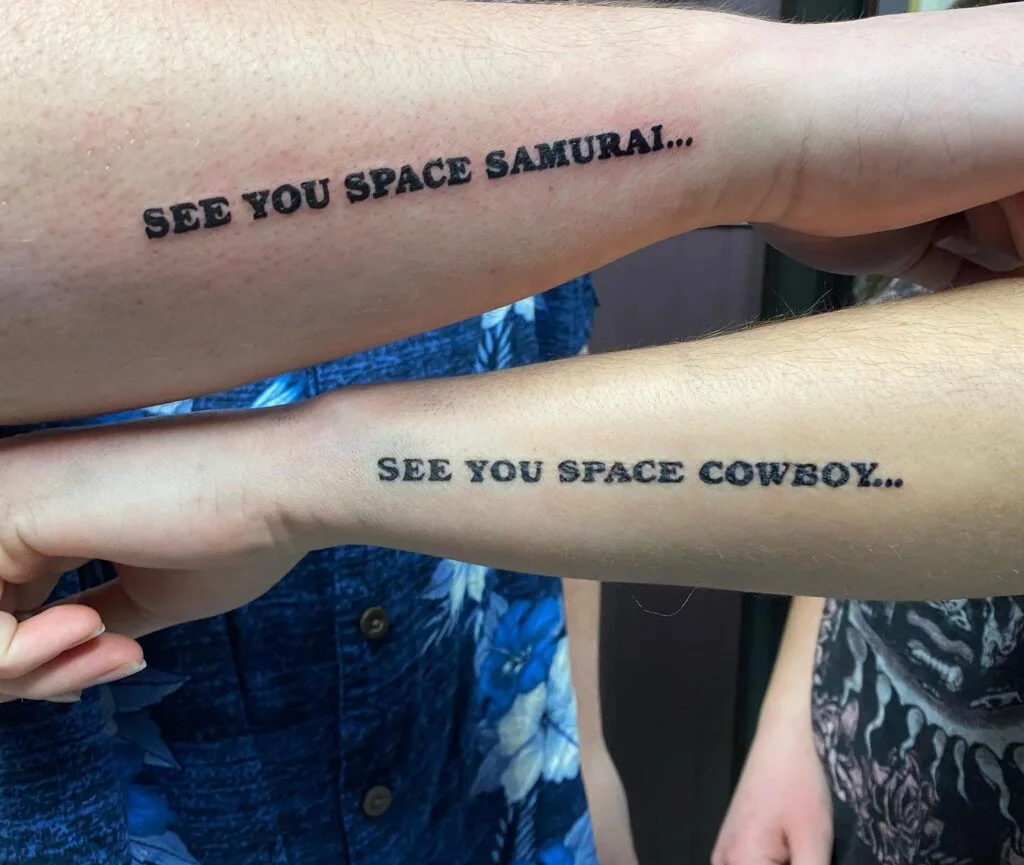 This sibling tattoo pairs two iconic phrases, “See You Space Cowboy…” and “See You Space Samurai…,” drawn from anime culture. Placed on the forearm, the bold black lettering symbolizes unity through shared fandom and love for storytelling.