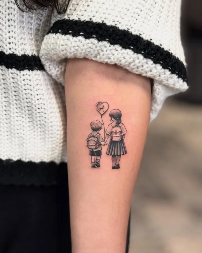 This tattoo depicts a young boy and girl in school uniforms holding hands, carrying backpacks, and sharing a balloon with a heart and initial. The detailed black-and-gray shading creates a soft, nostalgic feel, evoking memories of innocence and growing up together.