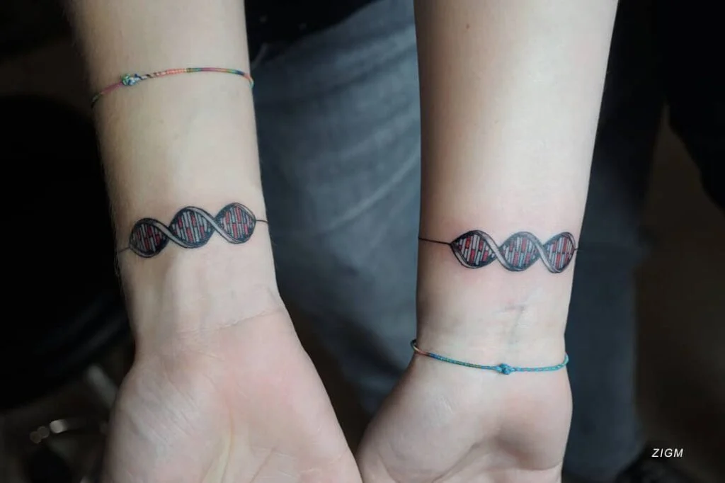 This sibling tattoo features a colorful DNA helix wrapping around the wrist, symbolizing the biological bond shared by family. Designed like a bracelet, the tattoo reflects the unbreakable connection written in their very genes. The use of red and black tones inside the helix adds depth and makes it visually striking. Siblings often carry different personalities, yet their