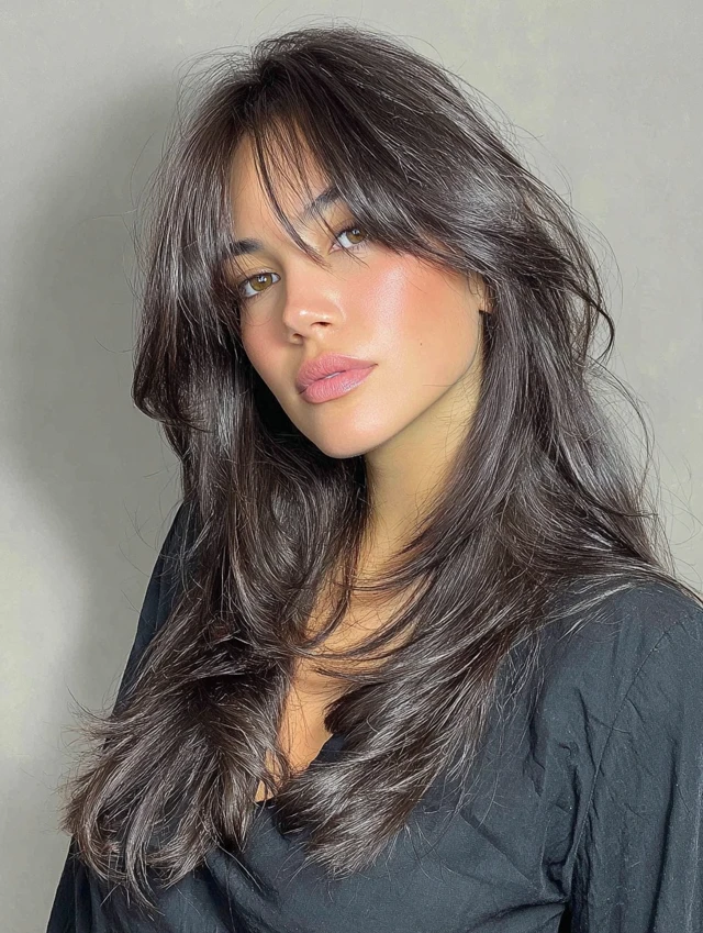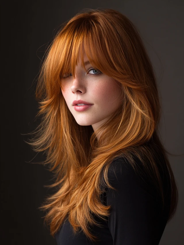 Soft, long bangs sweeping across the forehead create a subtle, elegant frame for the face.