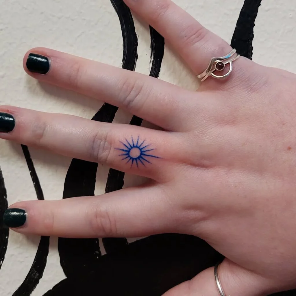 This tiny yet striking tattoo features a radiant sun etched in deep blue on the finger. Minimal in detail but impactful in meaning, it’s a perfect example of how less can say more. Its circular center surrounded by thin rays symbolizes clarity, protection, and a guiding inner light.