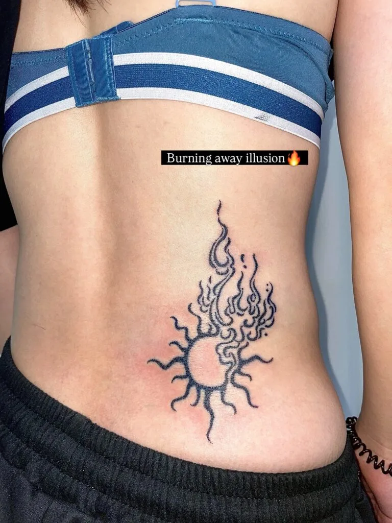 This design embodies intensity and individuality. For women, the rib placement makes it both intimate and daring. It’s a tattoo that captures energy and passion while reflecting inner fire. The flames symbolize transformation, a reminder to burn away illusions and shine with authentic light.
