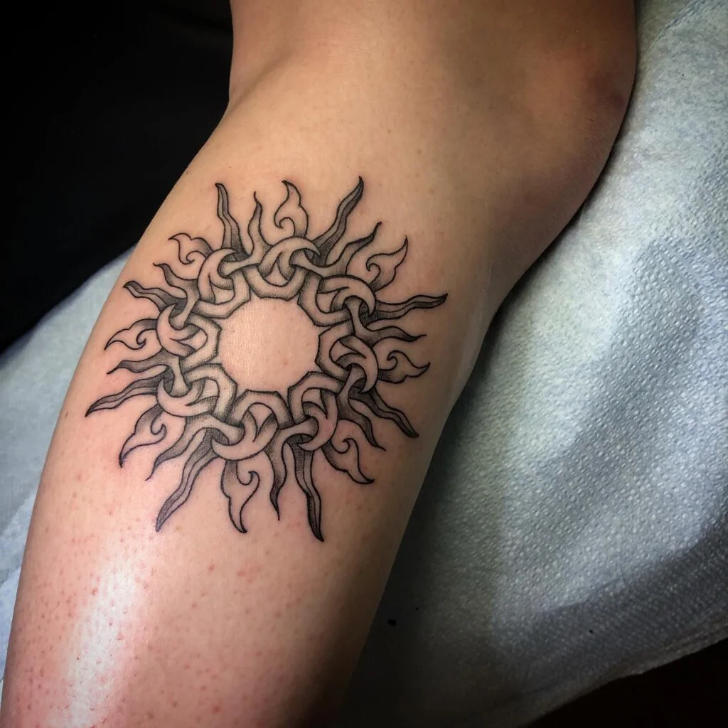 This intricate tattoo uses woven Celtic-style lines to form a radiant sun. Each flame interlocks seamlessly, symbolizing eternity, interconnectedness, and timeless beauty. Its bold detailing makes it captivating while retaining a sense of harmony.