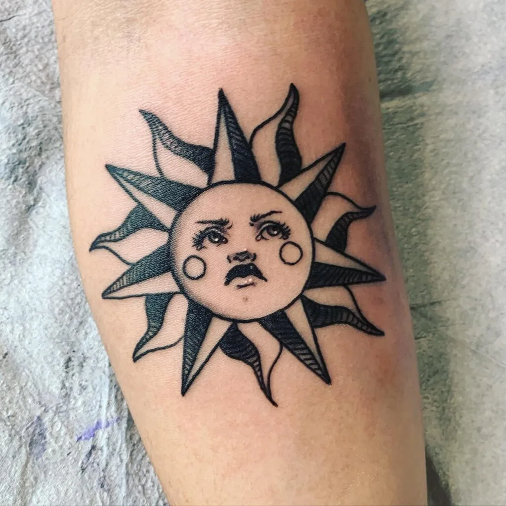 This bold black-ink design captures the sun with human features, giving it an expressive personality. The alternating shaded and bold rays radiate outward, symbolizing both warmth and strength. The detailed facial features add a dramatic, almost celestial presence, making it more than just a symbol—it becomes a character with depth.