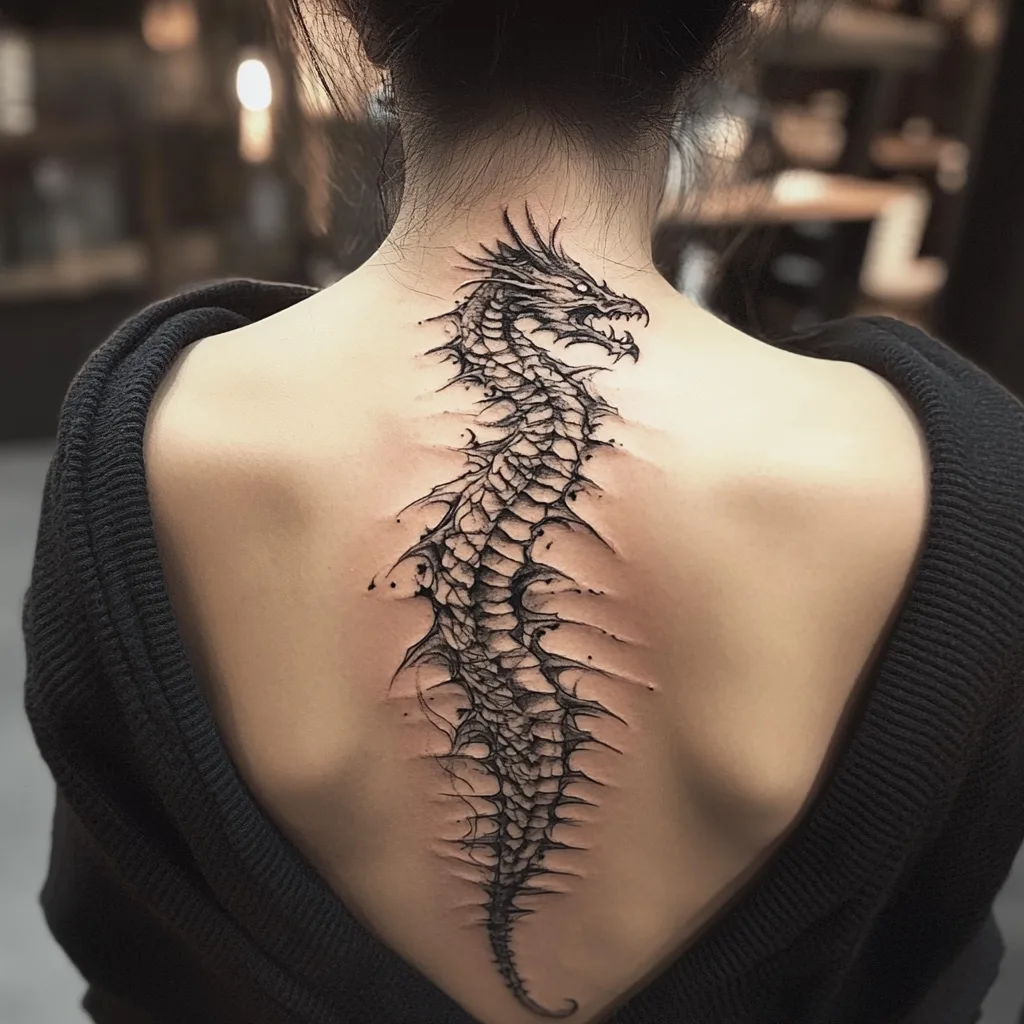 - Dragon Spine Tattoo A dragon tattoo along the spine represents strength, wisdom, and protection. Dragons are powerful mythical creatures, often depicted in motion, with their serpentine bodies curling gracefully along the spine’s length. Some designs feature a traditional Asian dragon with detailed scales and fierce eyes, while others opt for a minimalist silhouette for a sleek and modern aesthetic. A dragon tattoo makes a commanding statement, perfect for those who want to channel their inner power and confidence through bold body art.