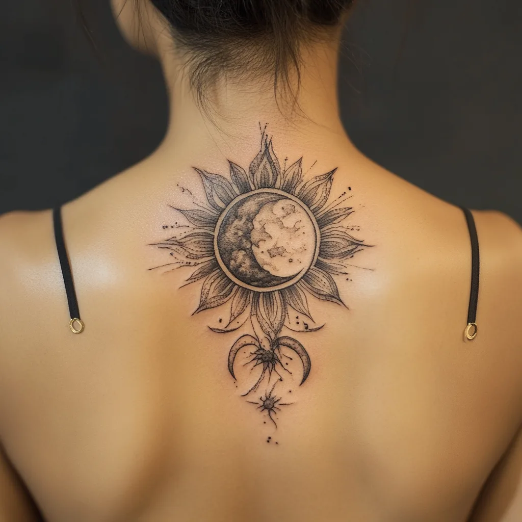 - Sun and Moon Tattoo A sun and moon tattoo along the spine represents balance, duality, and the interconnected forces of life. The sun symbolizes energy and vitality, while the moon embodies intuition and mystery. Some designs feature these celestial elements intertwined, creating a yin-yang effect, while others place them at opposite ends of the spine. Incorporating stars, clouds, or cosmic details enhances the celestial theme. This tattoo is ideal for those who appreciate both light and darkness and seek harmony within themselves and the universe.