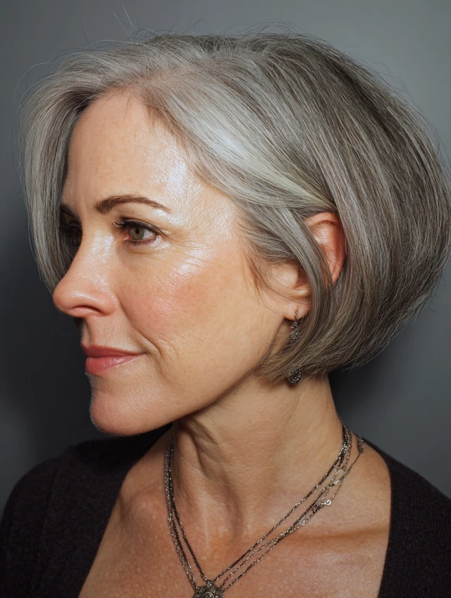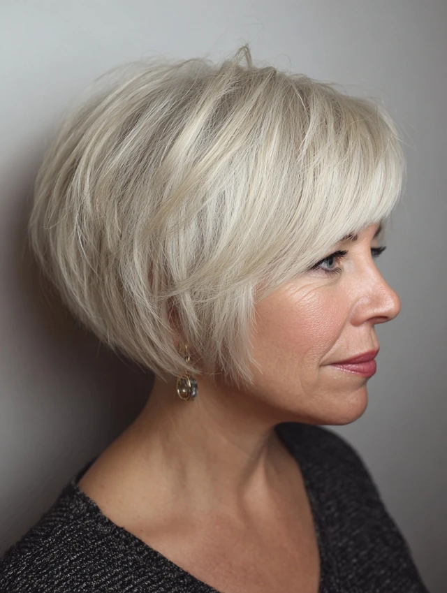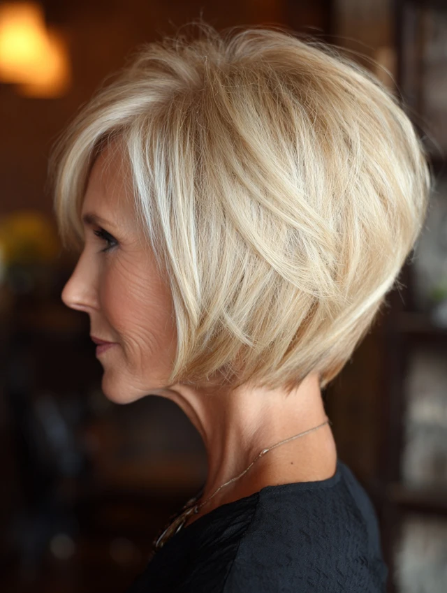 Stacked bob hairstyles for older women are defined by graduated layers at the back that build height, fullness, and a clean, sculpted shape. The stacking technique lifts the crown naturally, making the hair appear thicker while keeping the nape neat and controlled. This structured approach is especially effective for adding volume without relying on heavy styling.