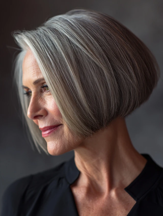 A sleek stacked bob emphasizes smooth lines and a polished finish. The clean structure highlights the stacked shape.