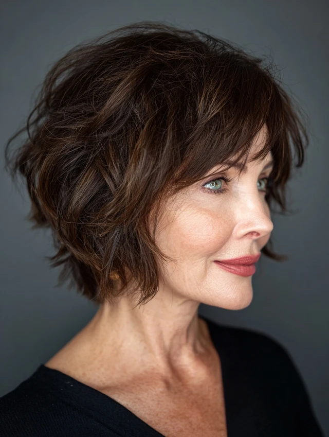 A tousled stacked bob embraces natural movement and a slightly messy finish. The texture softens the structured layers.