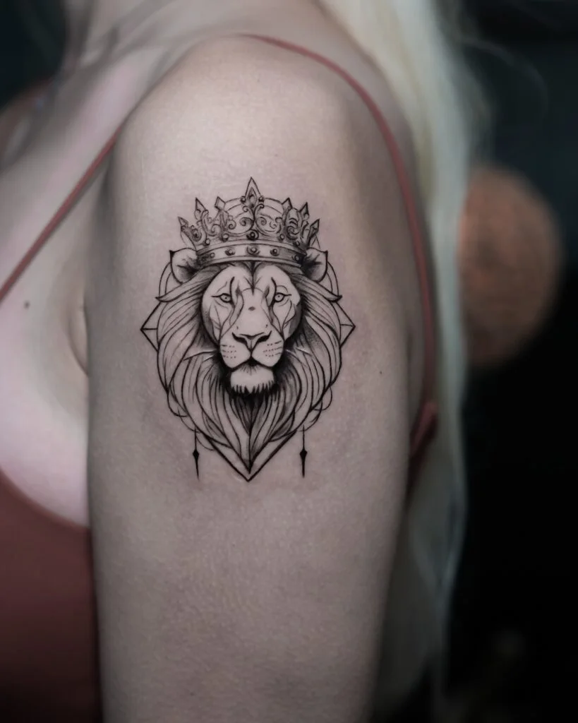 This stunning upper arm tattoo features a majestic lion wearing a detailed crown, symbolizing strength, royalty, and inner power. The fine linework, geometric framing, and soft shading elevate the lion’s fierce yet graceful expression.