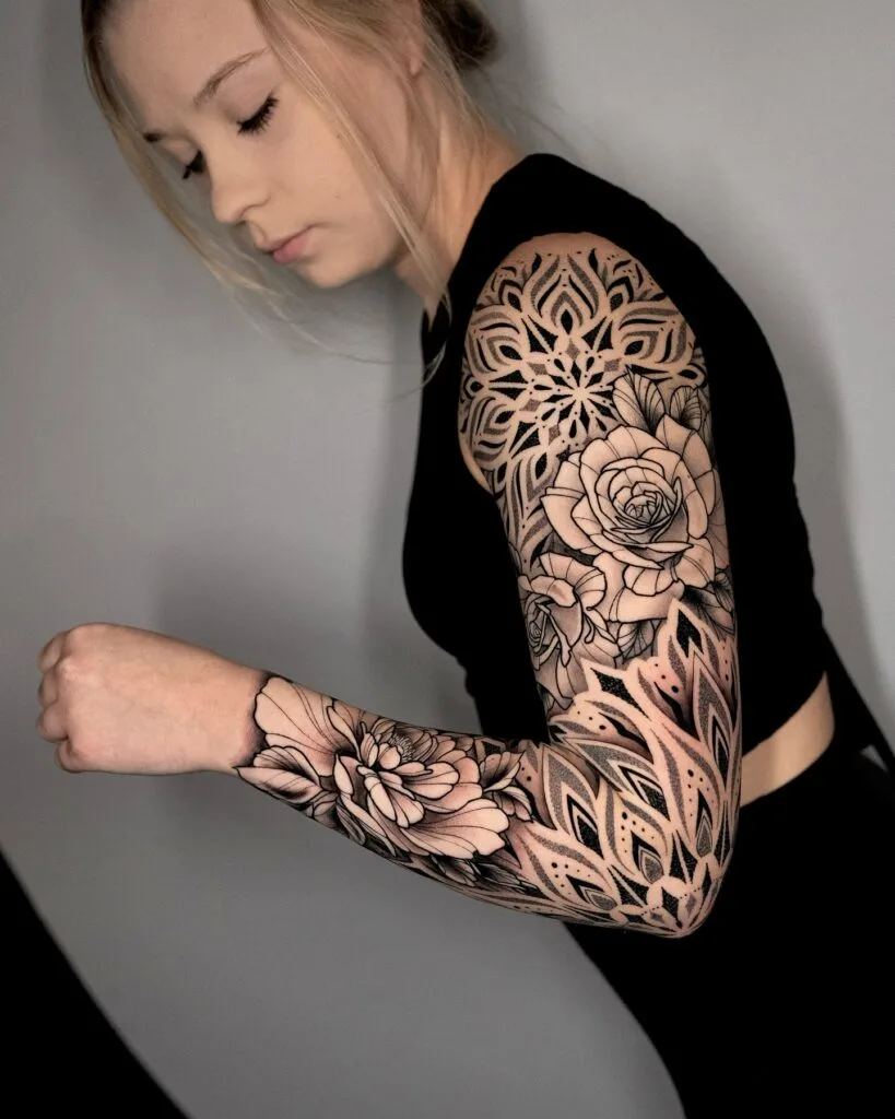 This full sleeve masterpiece blends blooming roses and mandala-style patterns into one breathtaking floral display. The balance of bold blackwork and delicate shading creates a mesmerizing visual flow from shoulder to wrist.