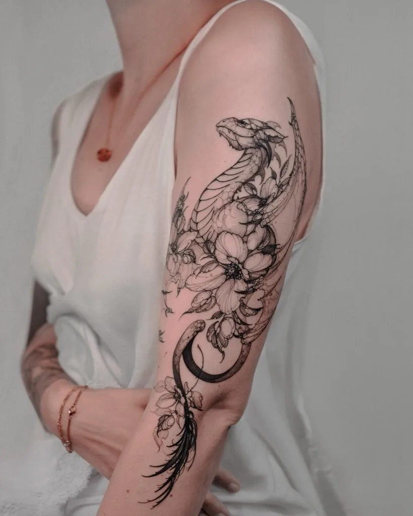This mesmerizing upper arm tattoo showcases a dragon entwined with lush floral blooms and delicate vines, merging fantasy with femininity. The dragon is drawn with intricate linework, its strength softened by the surrounding flowers and elegant composition.