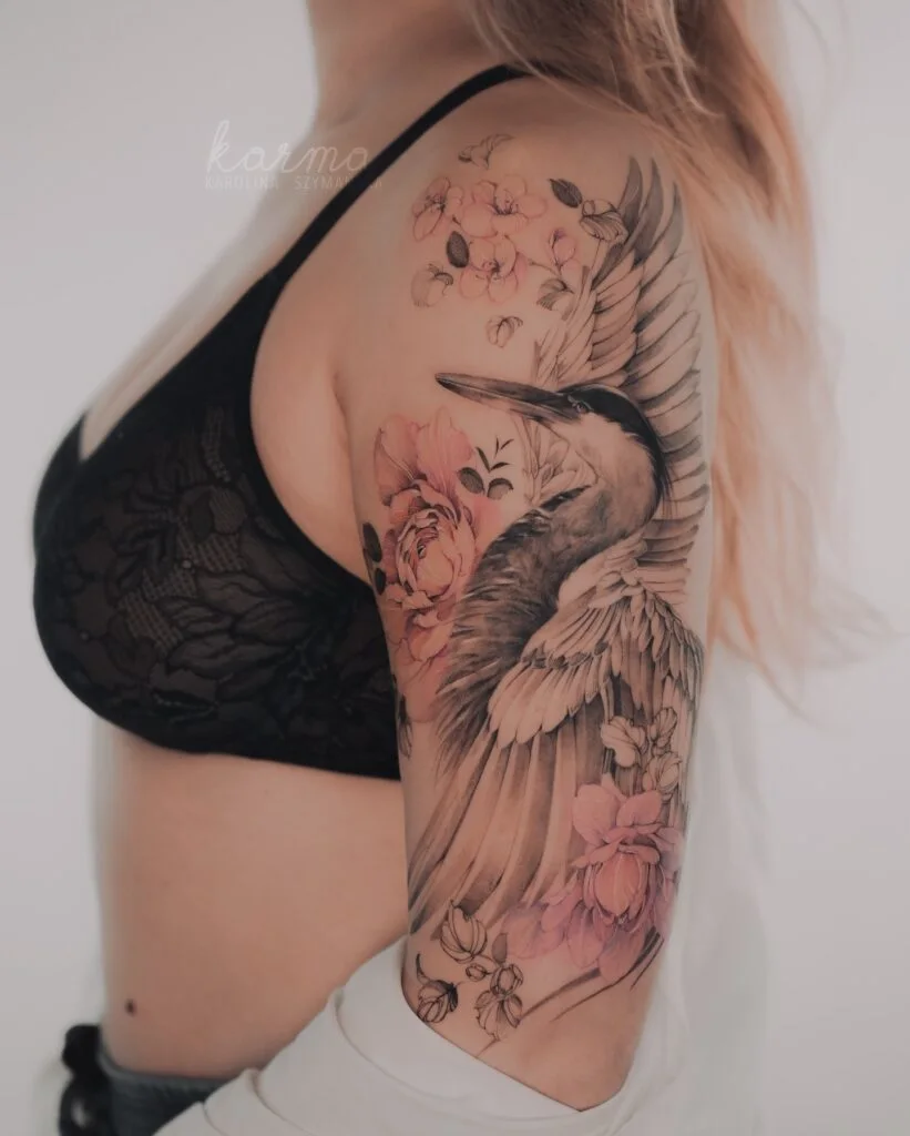 This half-sleeve tattoo features a majestic heron mid-flight, surrounded by soft pink blossoms and flowing petals. The combination of realistic shading with delicate watercolor-style florals creates a balance of motion and stillness.