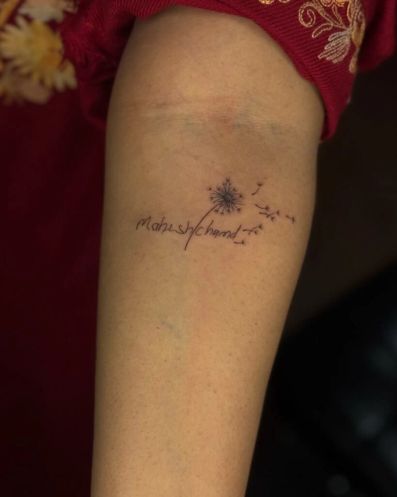 This poetic arm tattoo blends script and nature with a beautifully fine-lined dandelion transforming into softly floating seeds. Below, a name or word flows in delicate cursive, symbolizing memories, wishes, or a connection to someone special.