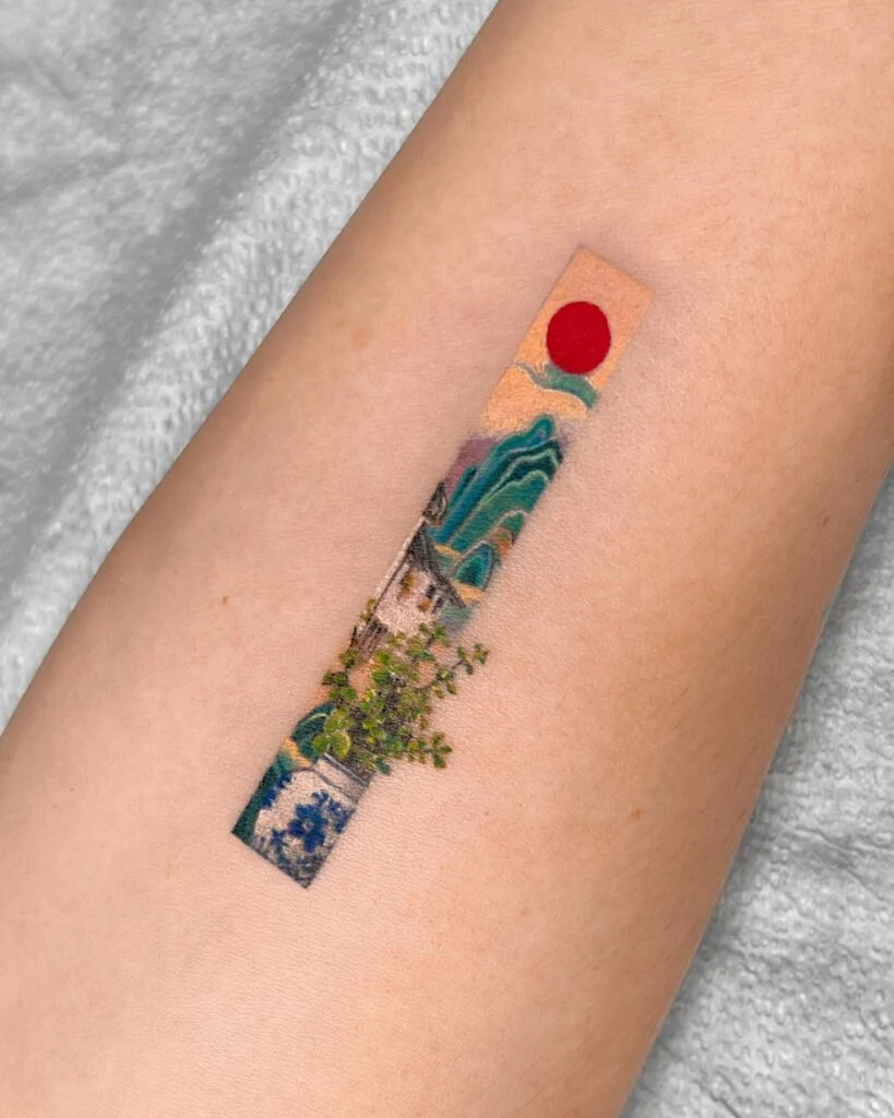 This miniature rectangle tattoo captures an entire scenic landscape in one narrow strip, making it a small but powerful visual narrative. With mountains, traditional structures, greenery, and a bold red sun, it offers peace, depth, and connection to nature in a hyper-realistic style.