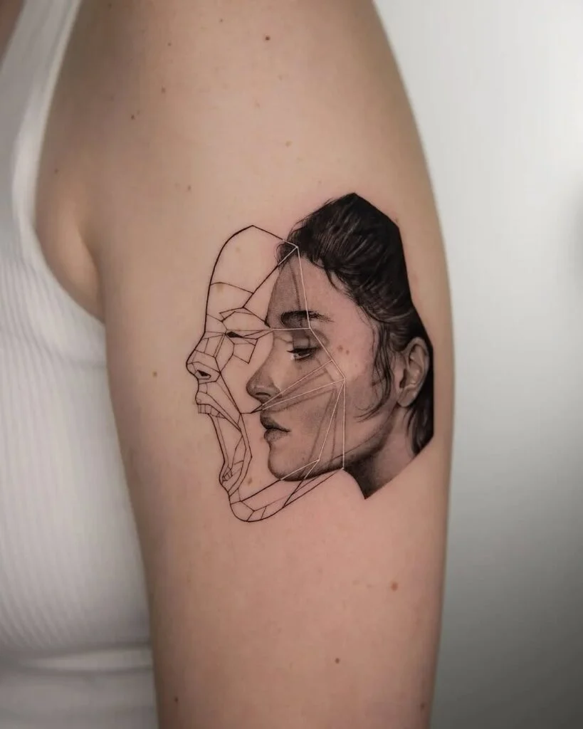 This thought-provoking tattoo blends photorealism and abstract linework, showing a woman’s serene face next to a transparent screaming mask. It’s a deep representation of duality—the face we show the world vs. the emotions we hide.