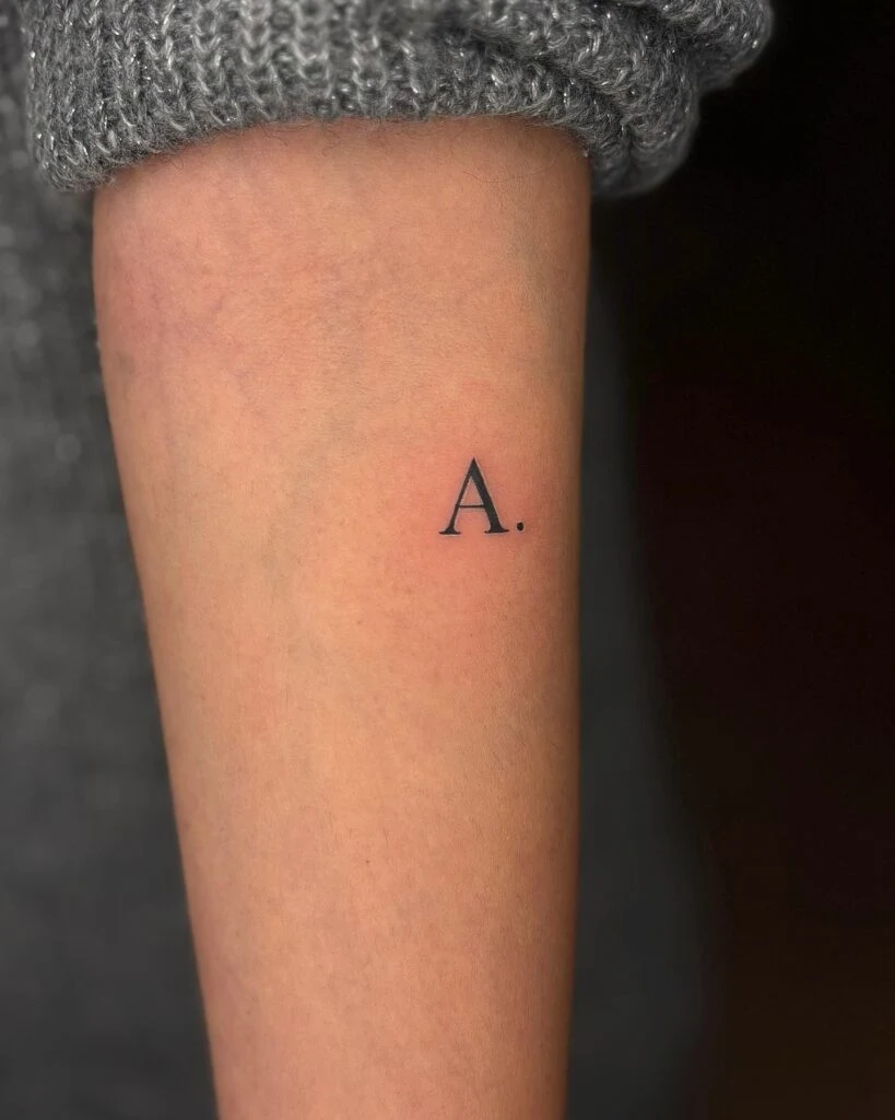 Sometimes the smallest tattoos say the most. This clean, minimalist arm tattoo features a single capital letter “A” with a period—subtle yet significant. It could represent a personal name, a loved one, or even a defining word.