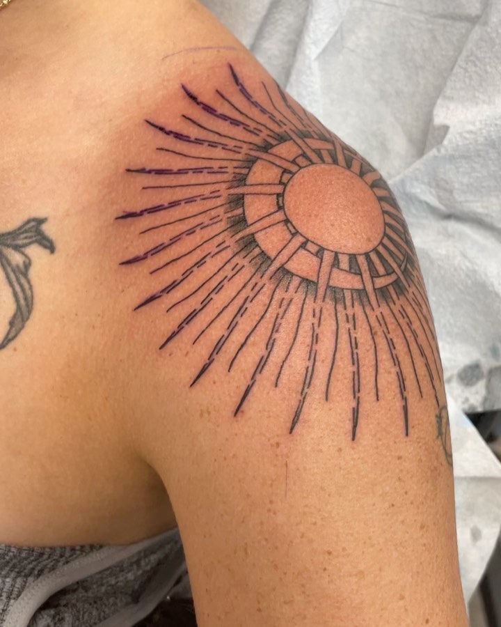 A large, geometric-style sun spreads across the shoulder, with radiating beams that give it a modern, structured look. This design stands out as both powerful and artistic, symbolizing resilience, leadership, and inner fire. Shoulder placement emphasizes strength, making it perfect for women who want their tattoo to represent empowerment and confidence.