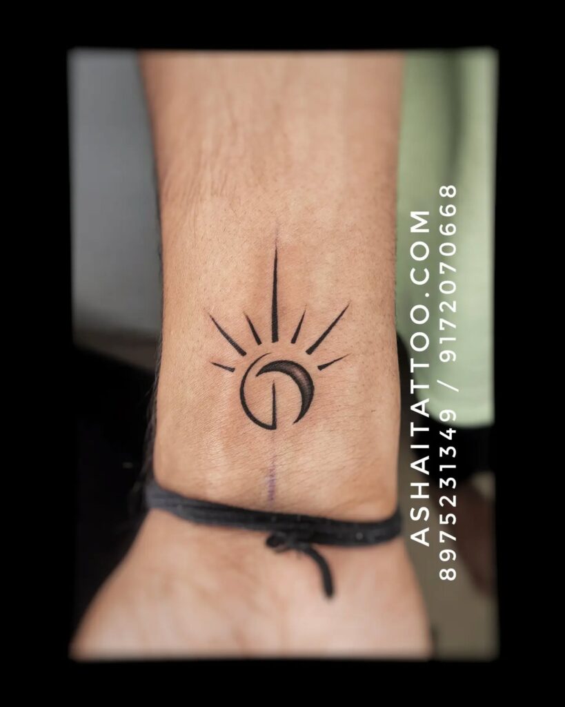 This design features a simple crescent moon and a small radiant sun placed side by side on the wrist. The clean linework and minimal style make it an elegant choice for women who want a subtle yet meaningful tattoo.