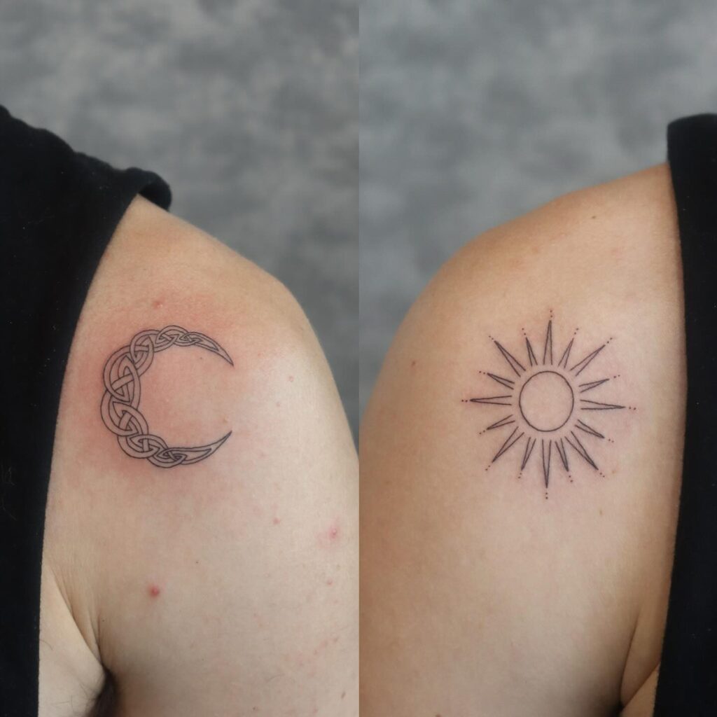 This paired tattoo shows a Celtic knot crescent moon on one shoulder and a radiant sun on the other. The Celtic knotwork adds depth, representing eternity, unity, and cycles of life, while the sun emphasizes strength and vitality. Placing them on opposite shoulders symbolizes balance between intuition and power, night and day.
