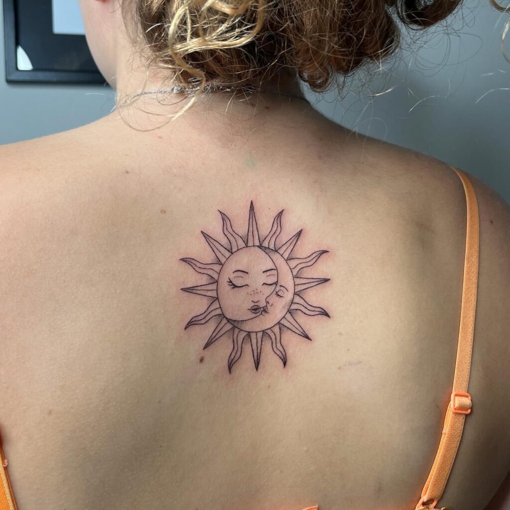 This back tattoo features a sun with a face, softly embracing a crescent moon. The linework is delicate, giving it a feminine and dreamy touch. Placed between the shoulder blades, it becomes a central, symbolic piece that embodies love, unity, and duality.