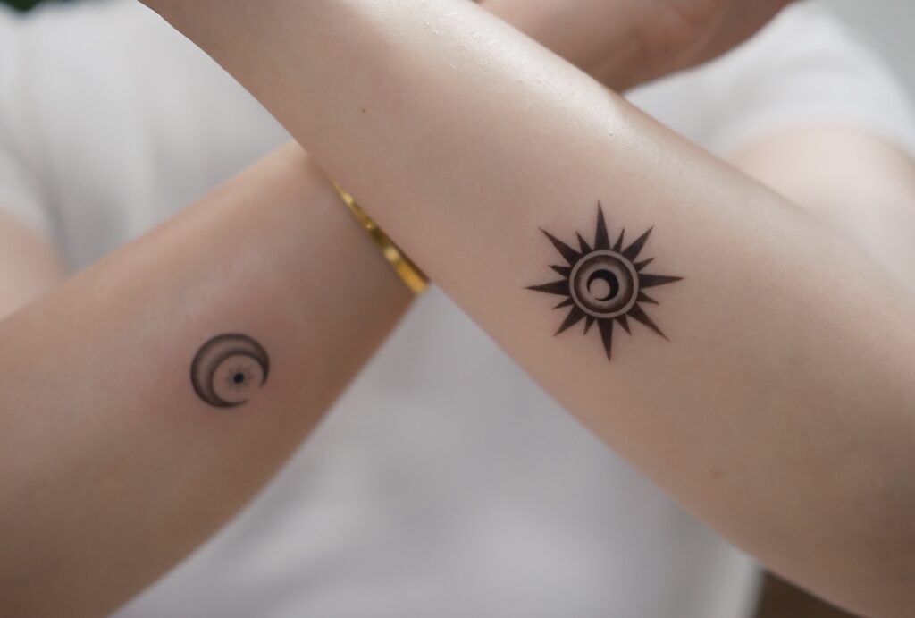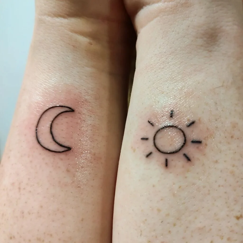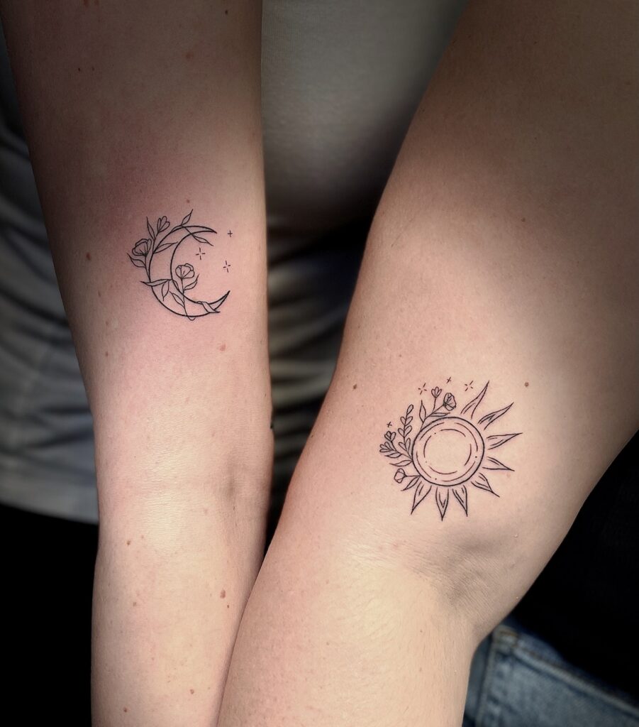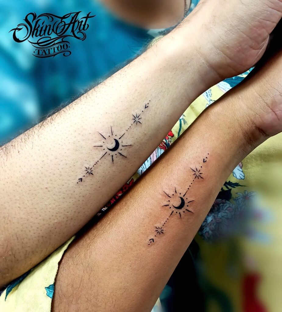 These matching tattoos feature the moon, sun, and stars aligned in a delicate celestial pattern across the forearm. The fine-line detailing adds elegance, while the constellation-inspired design creates a dreamy, cosmic feel.