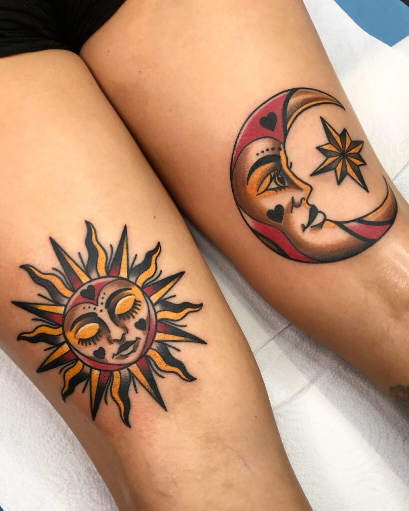 This set of tattoos showcases a sun with a serene face on one thigh and a crescent moon with a star on the other, both richly colored in bold reds, yellows, and blacks. The symmetry across both thighs highlights balance, unity, and celestial power.