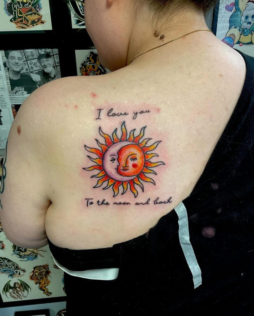This tattoo combines a radiant sun and crescent moon within one circular design, enhanced with script that reads “I love you to the moon and back.” The lettering adds emotional depth, turning it into a deeply personal piece of body art.