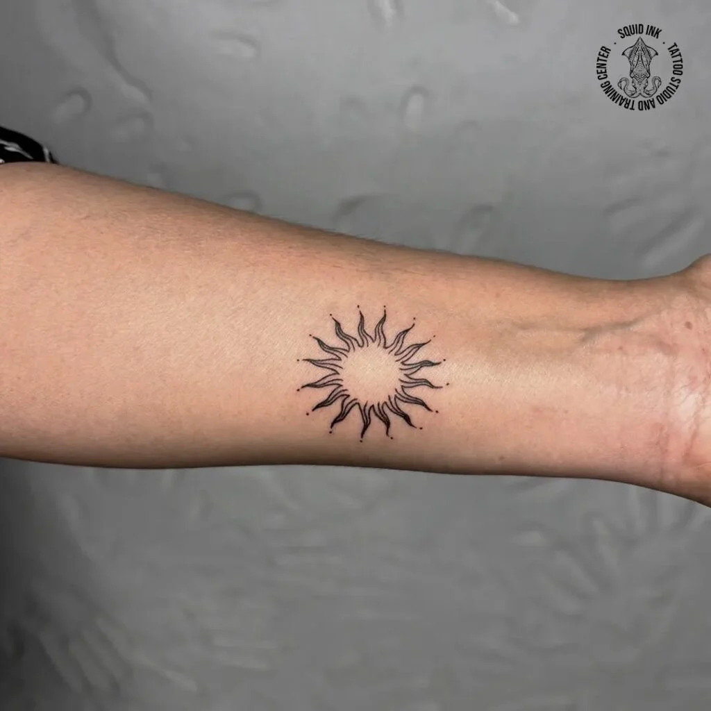 This tattoo features a radiant sun drawn with fine-line rays spreading outward in delicate detail. Placed on the forearm, it becomes a visible and empowering reminder of positivity and light. The design embodies warmth, protection, and energy, while the precision of its lines highlights artistic elegance.