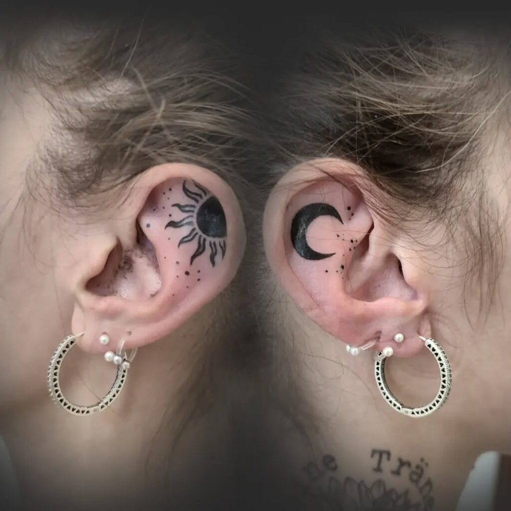 This creative tattoo design places a radiant sun inside one ear and a crescent moon inside the other, making it a unique and bold body art choice. The placement is unconventional yet stylish, perfect for women who want something discreet yet visually striking.