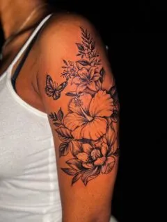 This tattoo set blends celestial symbols with nature, featuring a crescent moon intertwined with flowers on one arm and a radiant sun framed with leaves on the other. The addition of botanical elements softens the design, making it more organic and feminine.