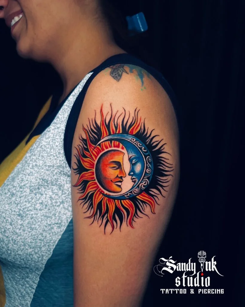 The placement on the upper arm makes it bold and eye-catching, while the vibrant palette gives it a dynamic, artistic feel. Women who choose this style often want their tattoos to symbolize wholeness and harmony. The design is timeless, combining classic celestial symbolism with modern artistry, creating a unique body art piece that reflects passion, duality, and personal strength.