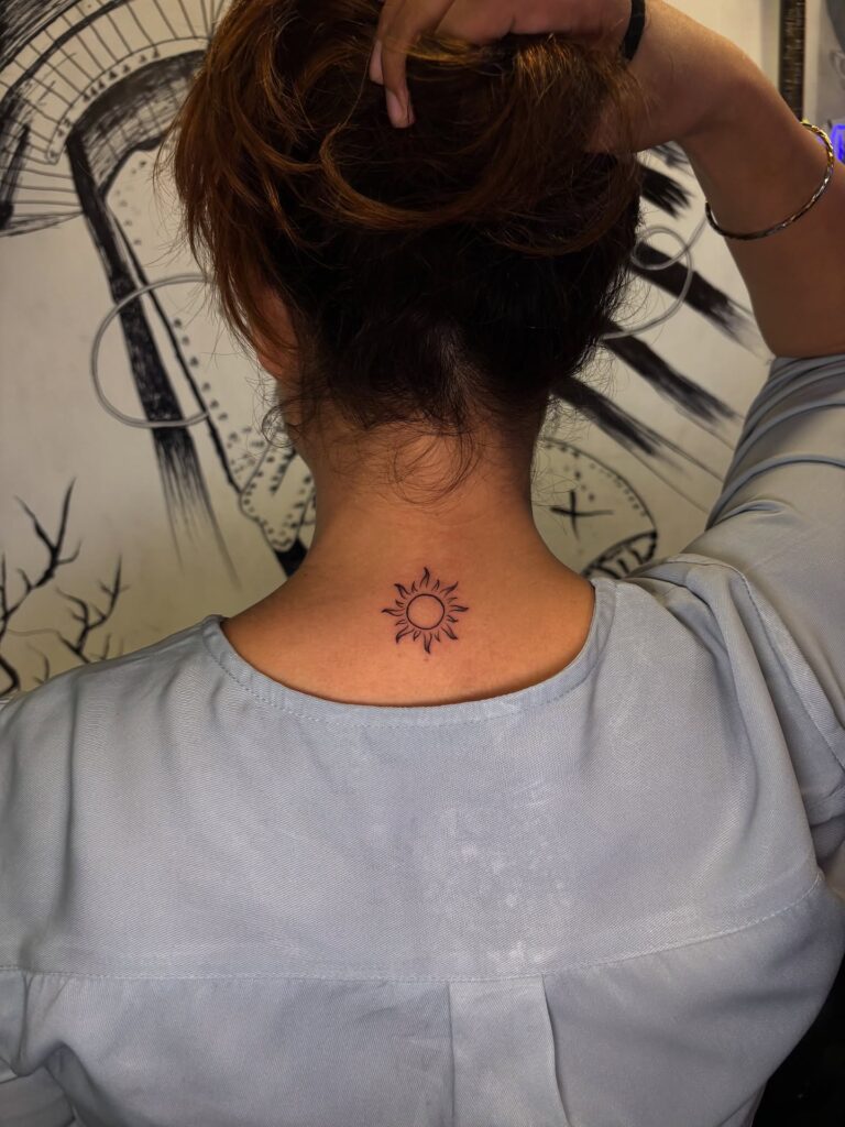 Placed delicately at the back of the neck, this tattoo features a bold sun design with radiating rays. Its placement makes it both personal and stylish, easily hidden or shown depending on hairstyle.