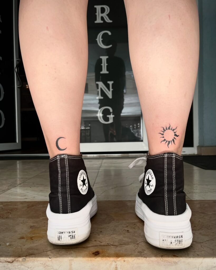 This paired tattoo shows the moon on one leg and the sun on the other, placed just above the ankle. The design is striking yet minimal, representing balance and duality. The moon embodies intuition and dreams, while the sun reflects vitality and action.