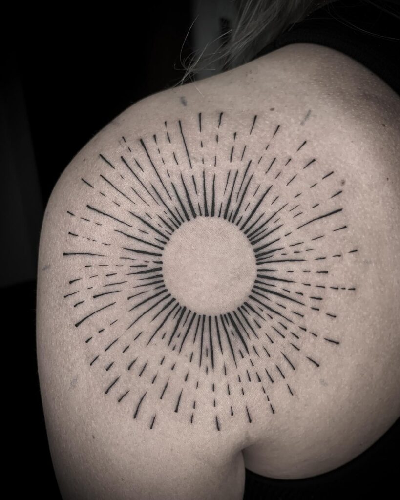 This striking tattoo spreads across the shoulder with fine black lines radiating outward from a bold circular center. The rays vary in length and density, creating a hypnotic effect reminiscent of the sun’s intense brilliance. Its scale and symmetry make it visually powerful and commanding.