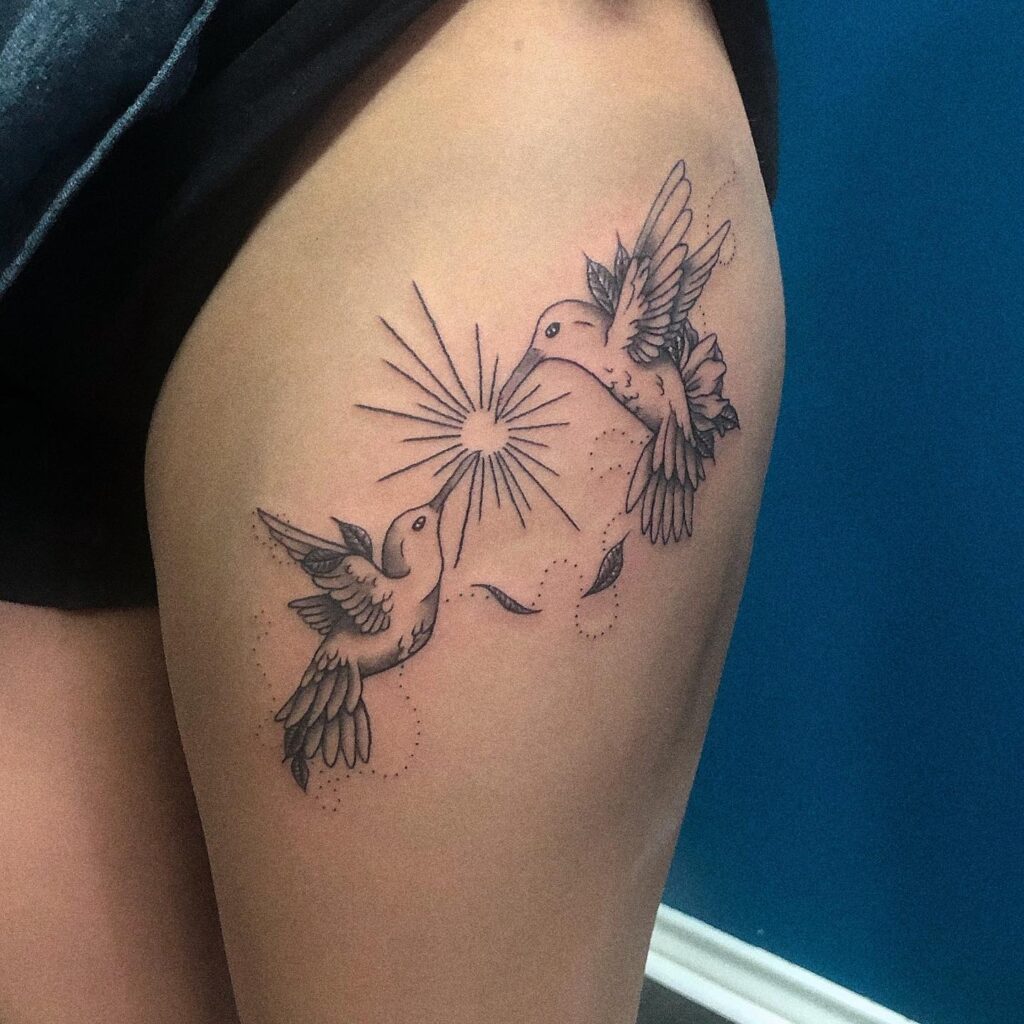 This delicate thigh tattoo depicts two hummingbirds gracefully surrounding a radiant sunburst. Their beaks point toward the central rays, almost as if drawing life and energy from the light. The dotted details and soft linework add elegance to the design.