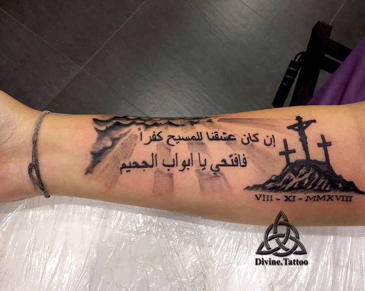 This striking design blends religious imagery and cultural expression. Rays of sunlight beam across the forearm, framing a hill with three crosses—an unmistakable Christian reference. Above, Arabic script adds a powerful message, making the tattoo deeply personal and unique.