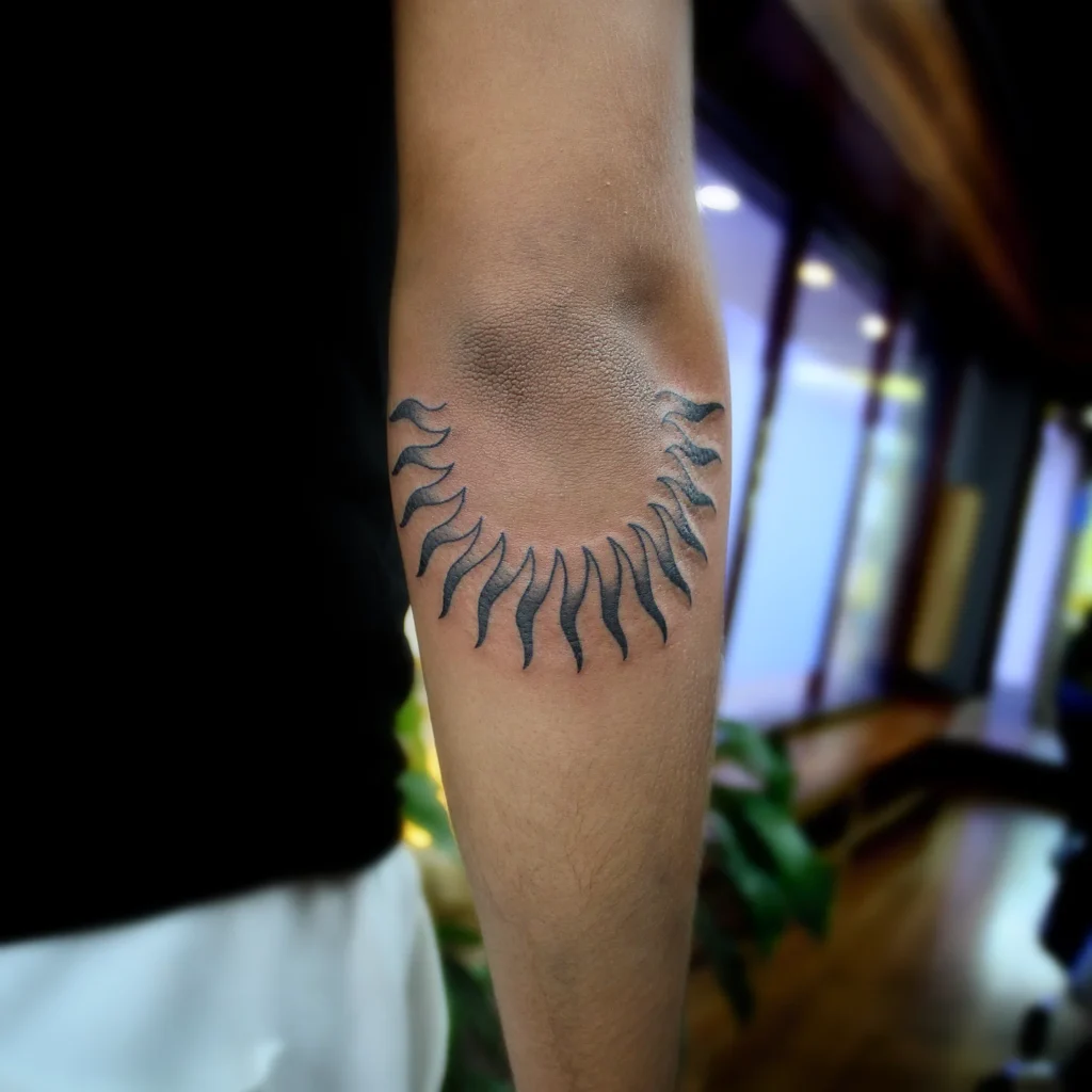 4. Semi-Circular Sun Rays Elbow Tattoo