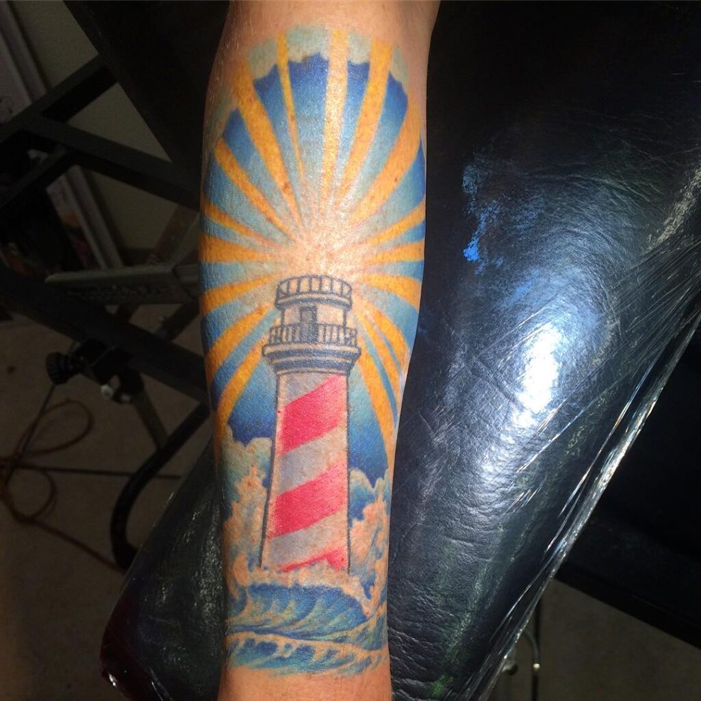 This colorful forearm tattoo features a lighthouse with bold red and white stripes, standing tall as beams of golden sunlight burst from behind. Surrounded by waves and clouds, the design symbolizes guidance, hope, and resilience during turbulent times. The combination of sea and sky creates a powerful scene of strength.