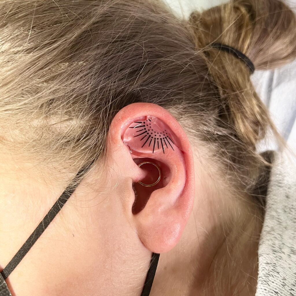Placed delicately inside the ear, this tattoo showcases a semi-circle of fine sun rays radiating outward. The minimalist design highlights creativity and uniqueness, offering a subtle yet personal piece that is visible only upon closer look. Its placement makes it both intimate and intriguing.