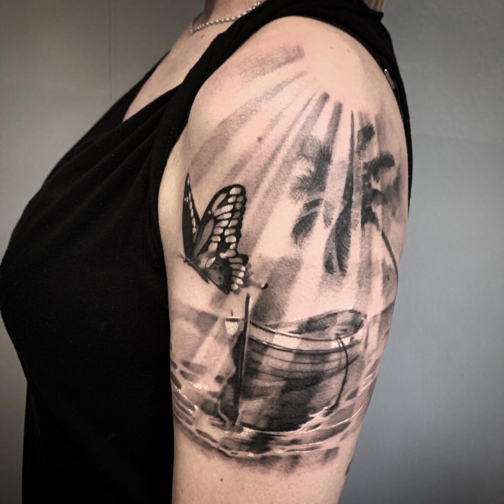 This arm tattoo tells a story of peace and transformation. Rays of light stream down onto a calm water scene, where a lone boat rests. A butterfly hovers gently above, symbolizing hope, change, and freedom. The grayscale shading adds a dreamy, ethereal quality to the piece.