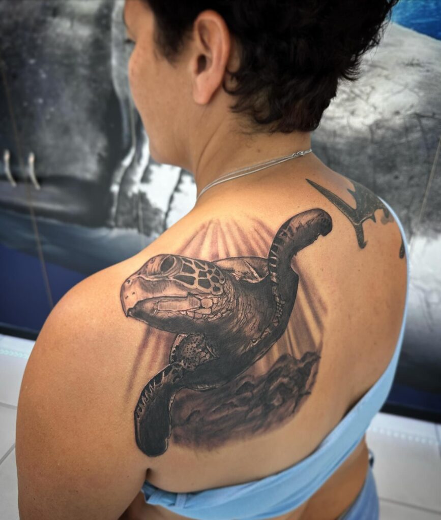 This large back piece features a realistic sea turtle swimming beneath glowing rays. The tattoo captures the harmony of marine life and light, as beams radiate upward, suggesting guidance and calm. Detailed shading gives the turtle depth and presence.