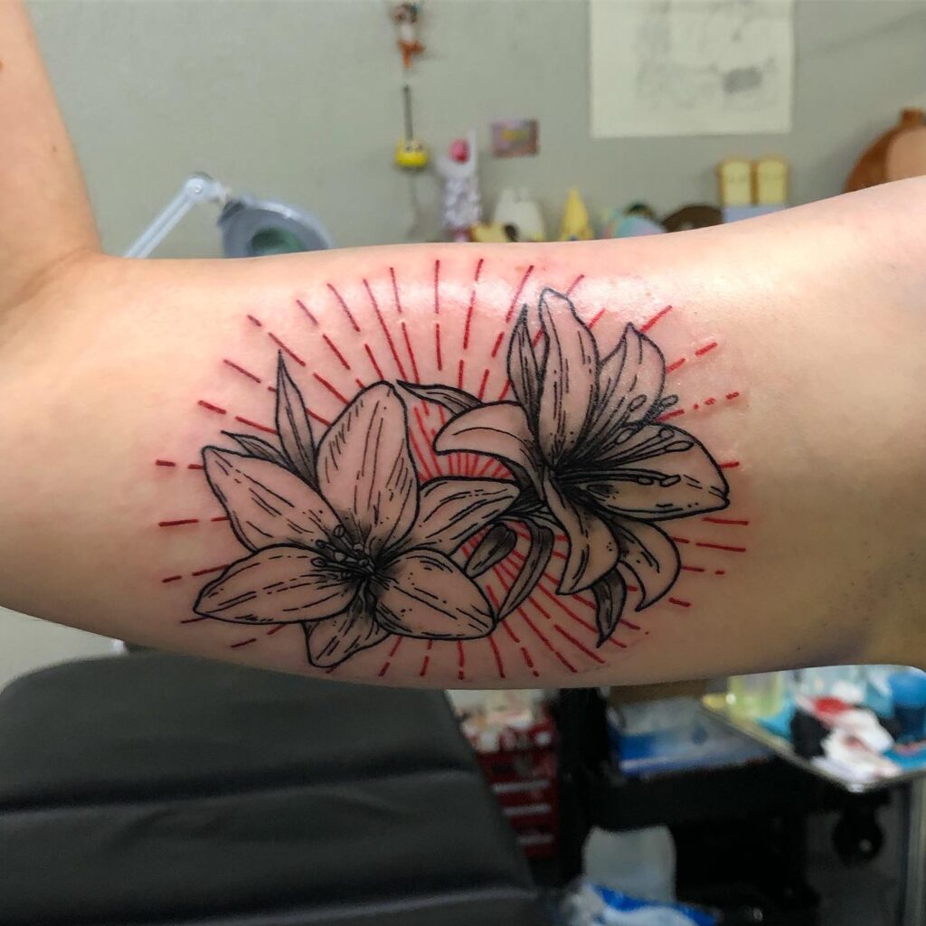 This tattoo combines the softness of blooming lilies with radiant sun rays. Red highlights emphasize the light beams, while the flowers in black ink bring a natural, graceful balance. It’s a beautiful blend of strength and femininity.
